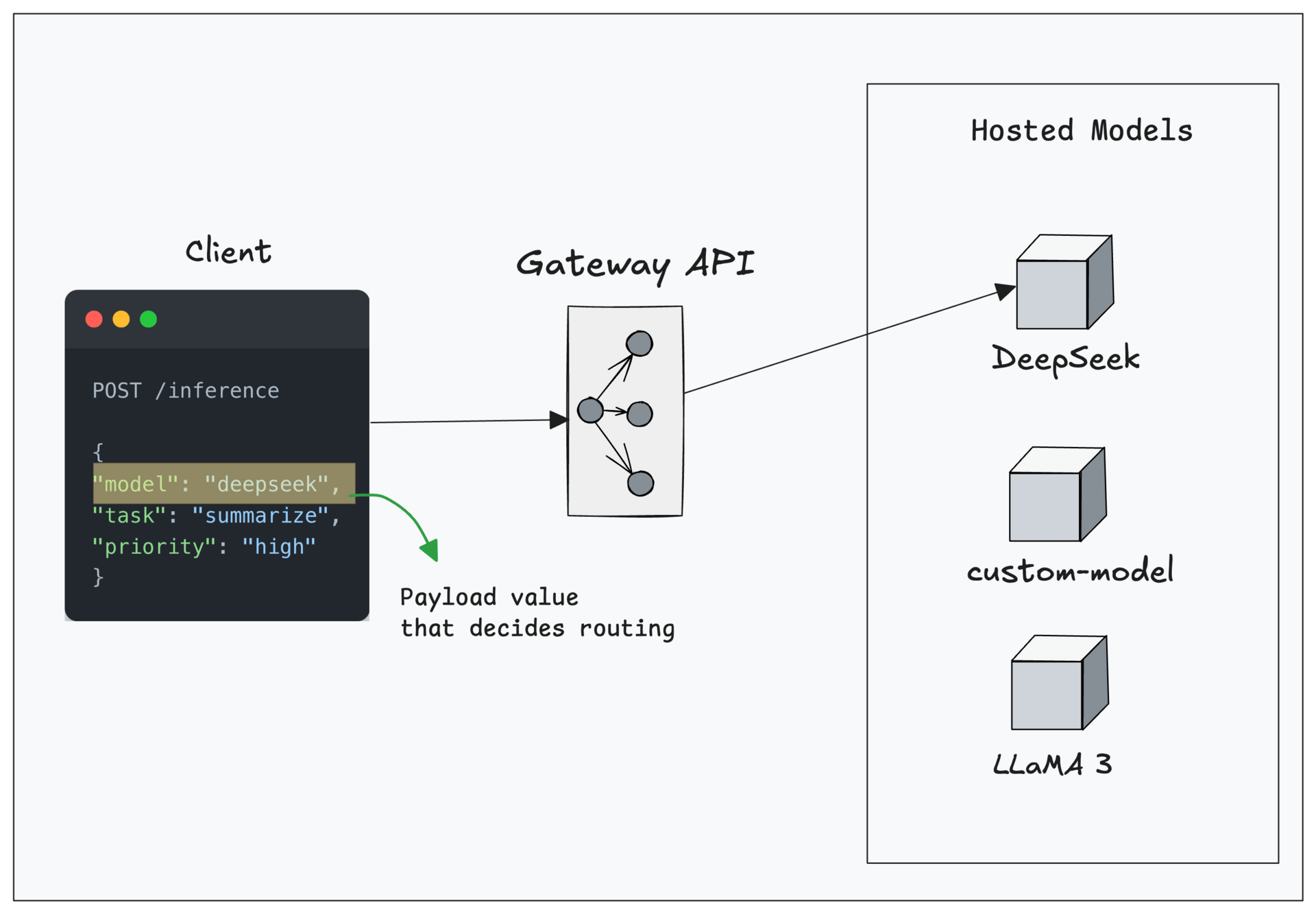 "model": "deepseek", the request goes to the deepseek model.If the body says