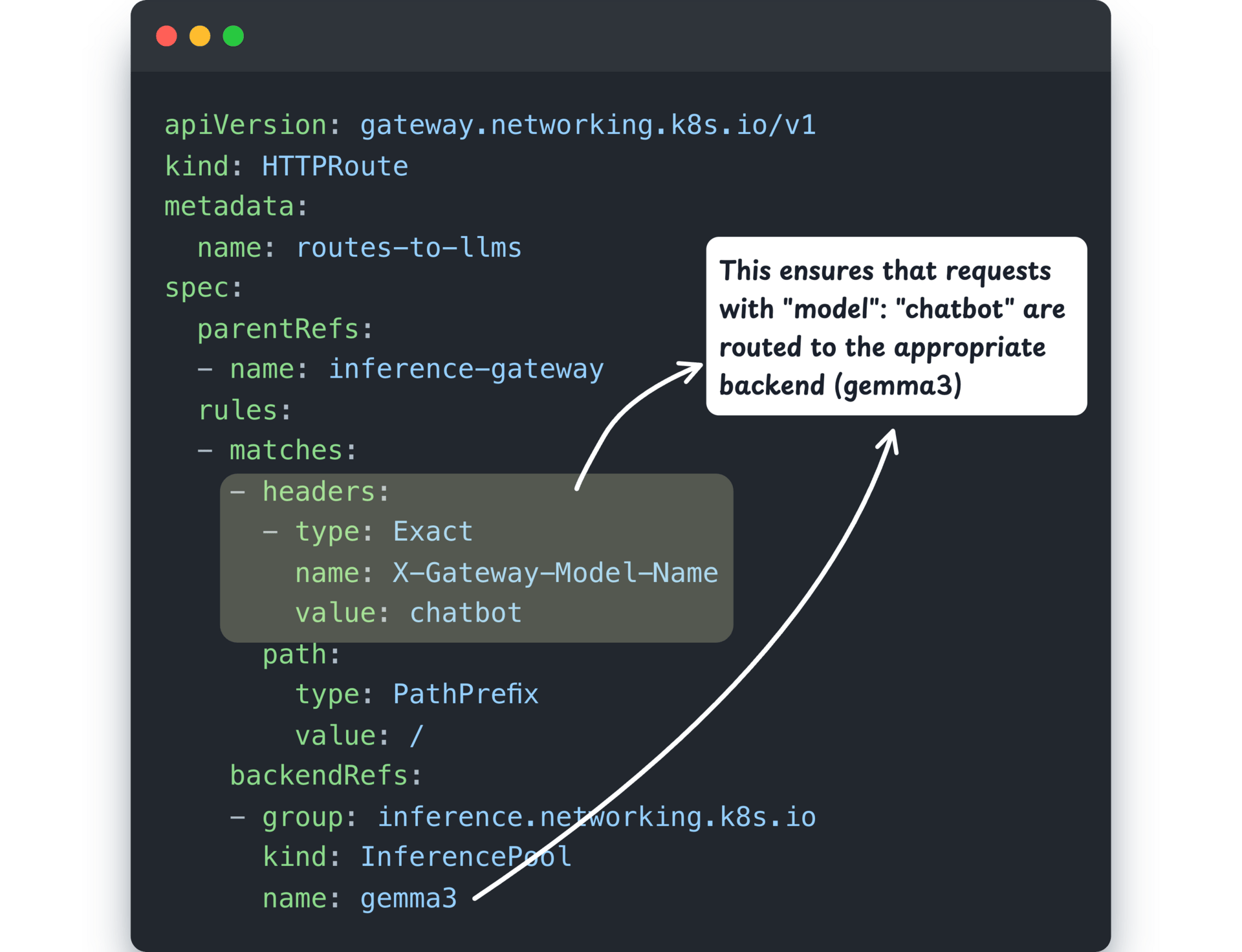X-Gateway-Model-Name: chatbotThe HTTPRoute rule matches requests that contain this header. Because the value is chatbot, the request is routed to the backend InferencePool/gemma3