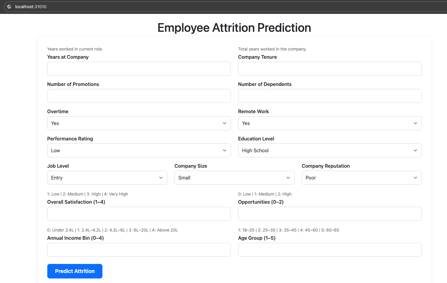 Enter the values and click the Predict Attrition button. You will get the prediction values as follows.