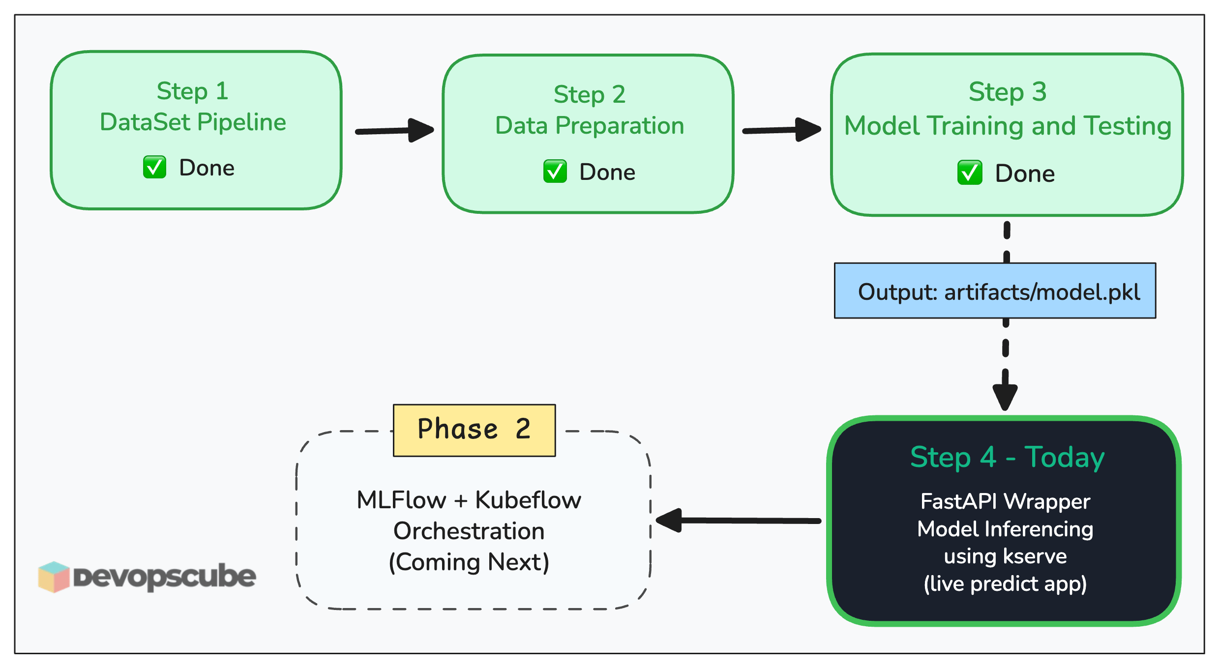 We are still in Phase 1, taking model.pkl all the way to a live inference endpoint on a local Kubernetes cluster.