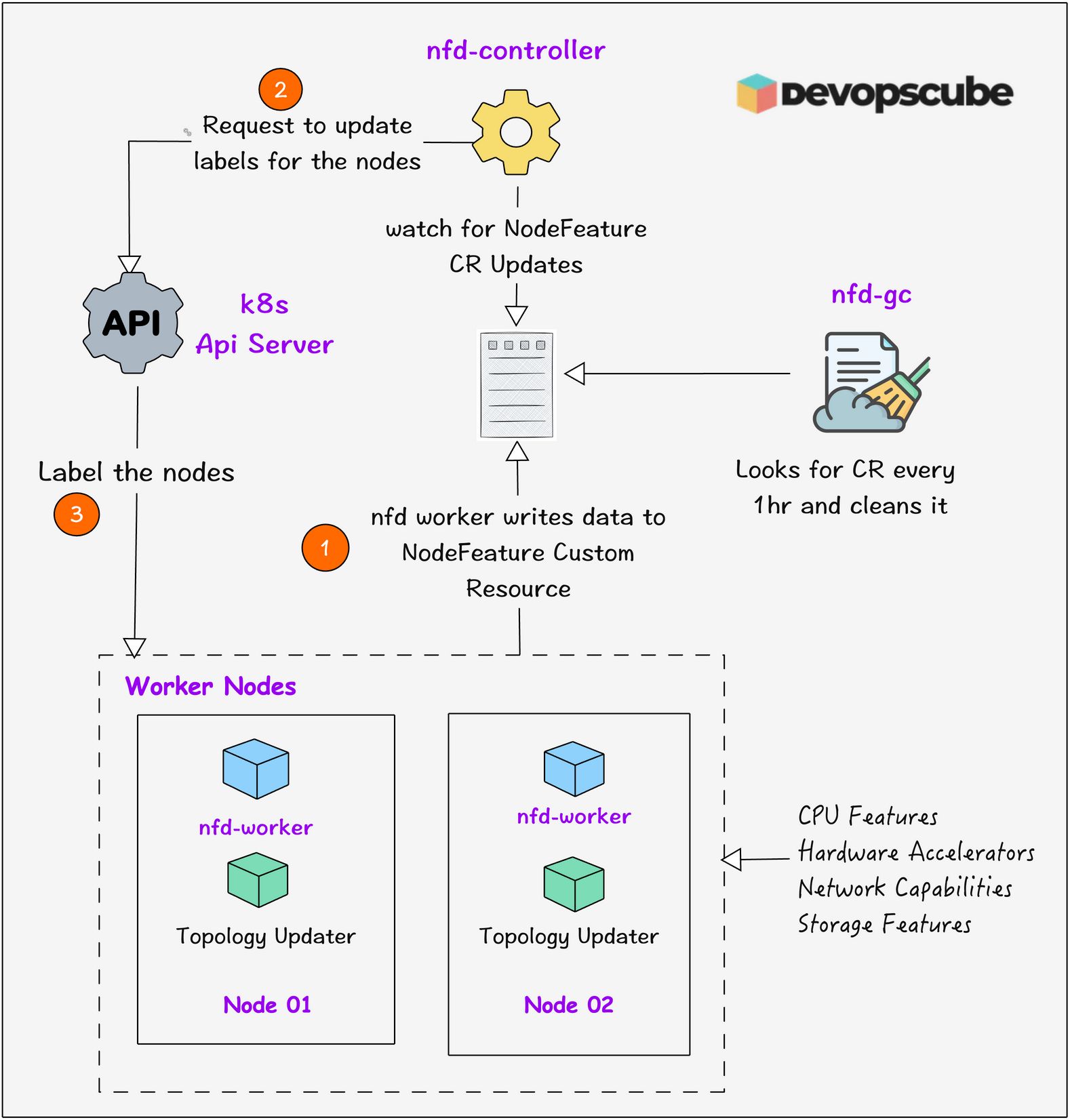nfd-worker runs as a DaemonSet on each node. It scans multiple sources (CPU, memory, PCI, etc.) and writes raw feature data into NodeFeature custom resources.