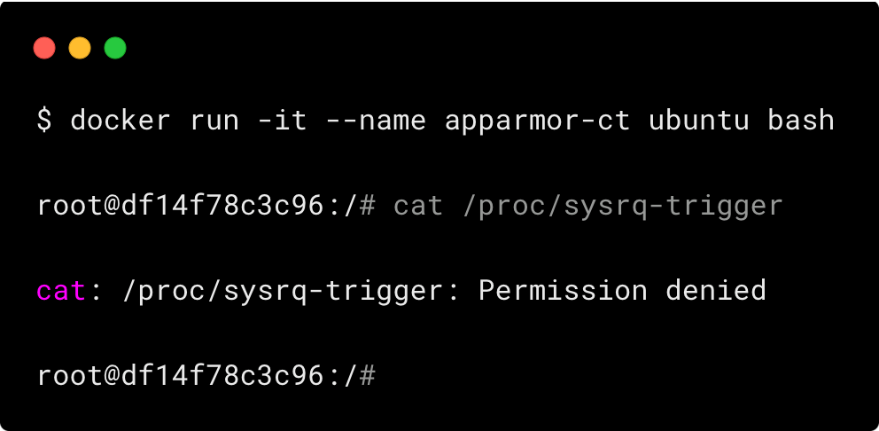 Here is a simple example that shows docker default AppArmor profile blocking reading /proc/sysrq-trigger using cat.